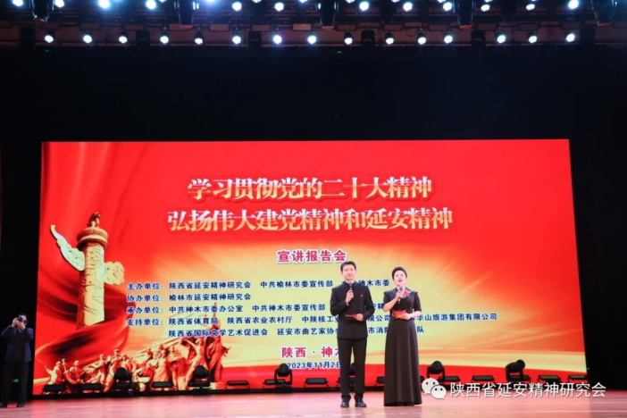 2023年10月31日—11月2日,为深入学习贯彻党的二十大精神和习近平总书记瞻仰延安革命纪念地时的重要讲话精神,大力弘扬伟大建党精神和延安精神,陕西省延安精神宣讲团受邀走进榆林市、神木市和绥德县,开展了以“学习贯彻党的二十大精神 弘扬伟大建党精神和延安精神”为主题的延安精神宣讲报告会。省延安精神研究会常务副会长张文波、省委党校(陕西行政学院)教授、省延安精神研究会副秘书长兼宣讲团副团长王晓莉以及榆林市、神木市市级领导、市直各部门、各事企业单位负责人和市延安精神研究会会员以及部分县区延安精神研究会负责人参加宣讲报告会,与会人员深受教育鼓舞,引起热烈反响。