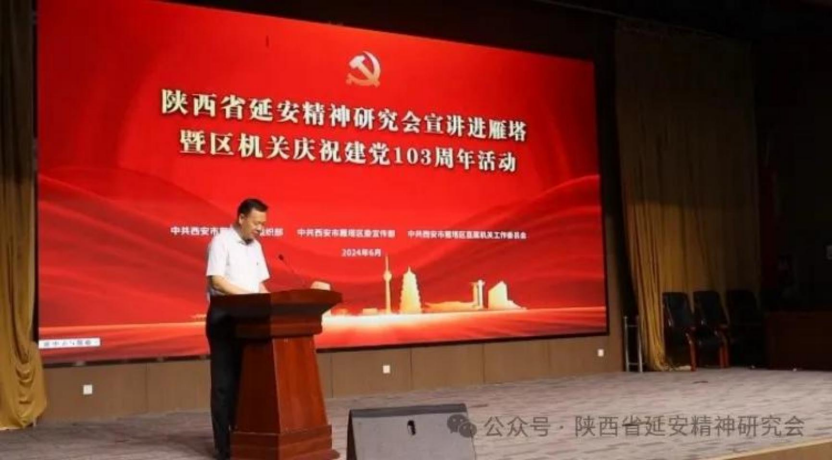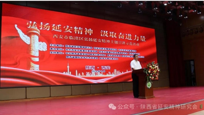 2024 年 6 月 24 日 至 28 日 ,为深入学习贯彻党的二 十大精神和习近平总书记在瞻仰延安革命纪念地时的重要讲话精神 , 大力弘扬伟大建党精神和延安精神 , 配合党纪学习教育的各项要求 , 有效推进延安精神 “ 五进 ” 工作 , 陕西省延安精神宣讲团受邀分别走进省科技厅、 雁塔区、 碑林区、 新城区、 临潼区、 周至县、 阎 良县、 未央区以及陕鼓集团开展延安精神主题宣讲报告会 。 省延安精神研究会常务副会长张文波、 郭润芝 , 副会长赵志祥、 史俊琴分别代表我会出席活动。
