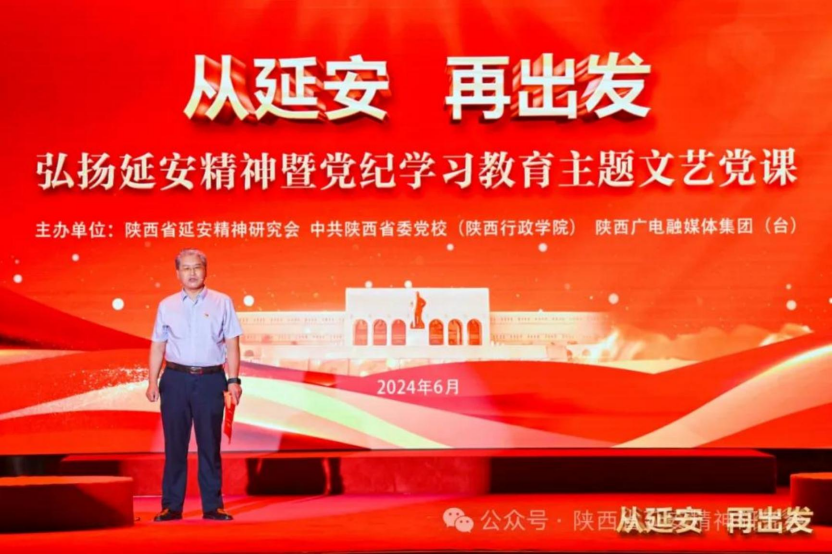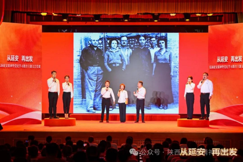 6 月 19 日 , 由陕西省延安精神研究会、 省委党校(陕西行政学院) 、 陕西广电融媒体集团(陕西广播电视台) 共同策划的弘扬延安精神暨党纪学习教育主题文艺党课——《从延安 再出发》在陕西省委党校(陕西行政学院) 成功首演。