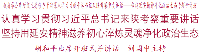 6月23日,全省市厅级主要领导干部深入学习习近平总书记来陕考察重要讲话——弘扬延安精神净化政治生态专题研讨班在延安开班。省委书记胡和平出席开班式并讲话。他强调,要认真学习贯彻习近平总书记来陕考察重要讲话,继承和弘扬延安精神,讲理想、讲信念,讲政治、讲党性,讲纪律、讲规矩,做人民的公仆、事业的骨干,实事求是、真抓实干,奋力谱写陕西新时代追赶超越新篇章。