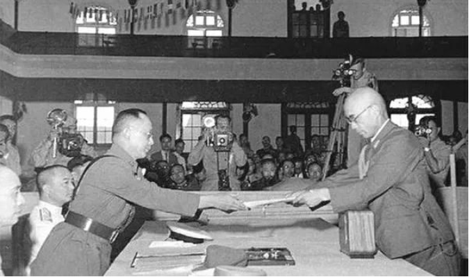 1945年9月9日上午,何应钦(左)在南京陆军总部大礼堂主持受降典礼,冈村宁次(右)在日本投降书上签字