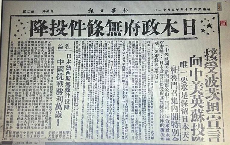 8月10日晚,新华社记者正在延安清凉山收、编稿件,在接收路透社的电讯稿时,忽然抄到了好几个特急信号,这在以前是没有过的。新华通讯社的副社长吴文涛在场,大家焦急地等待着这个特急消息的出现。很快,一行“日本侵略军投降了”标题出现在电文纸上。标题下是,日本政府通过瑞士、瑞典转中、美、英、苏四国,表示愿意接受《波茨坦公告》。新华通讯社的窑洞顿时欢腾了起来,大家一时抑制不住内心的激动,跳呀,叫呀!待冷静下来之后,想到得马上把这个消息报告毛主席。毛泽东在听到新华社的电话报告后,也高兴地连声说道“好哇!好哇!”并要同志们再注意收集其他国际通讯社的消息。严格来讲,此刻日本还是“乞降”,在接到认为可行的答复前并未投降。但是,日本投降了的消息,像响彻云霄的一声炸雷,在延安上空迅速传播开来。