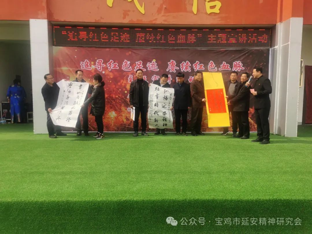 演出过程中,宝鸡市延安精神研究会向陈仓拓石镇党委、拓石镇孟家塬村党支部和学校赠送了红色书法作品。