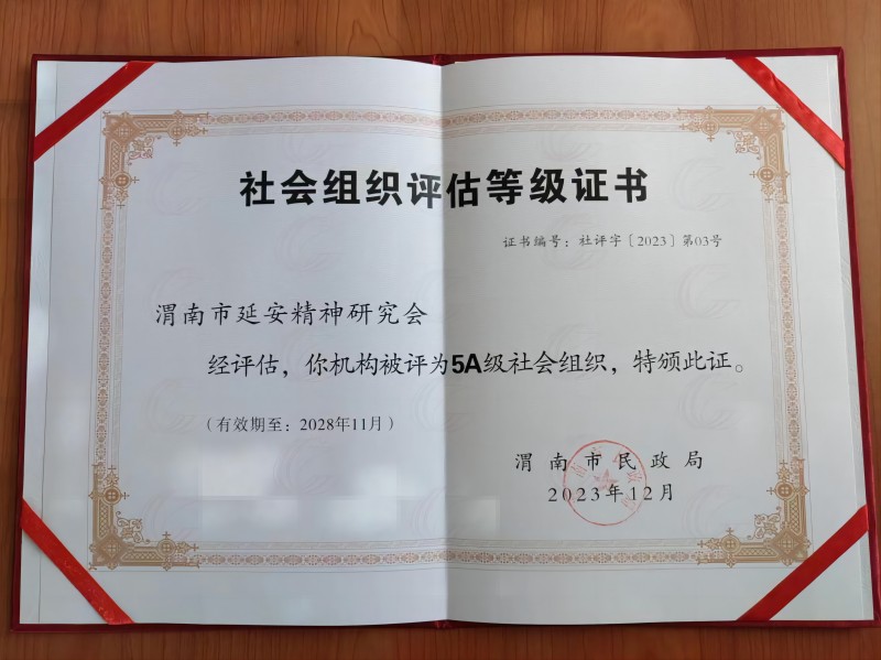 3月18日,在渭南市民政局2024年全市社会组织登记管理工作会议上,渭南市延安精神研究会获评“5A级社会组织”称号。