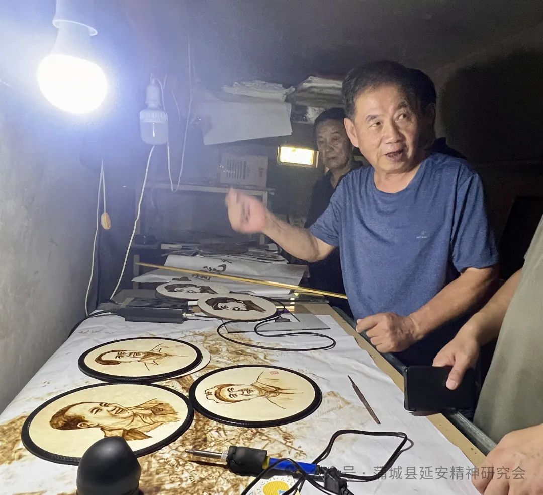 烙画又称“烫画”,是用火烧热烙铁在物体上熨出烙痕作画。宣纸烙画是对宣纸绘画和烙画的艺术结合,既有中国传统绘画的民族风格,又有西洋画的写实效果,具有独特的艺术魅力,给人以古朴典雅之感。烙画作为一种古老的艺术形式,有着深厚的历史渊源,是我国民间珍贵的稀有画种,堪称"中华一绝",也是国家非物质文化遗产的重点保护对象。70岁的蒲城烙画传承人董涛,亲自将自己创作的毛泽东画像及诗词作品展示给大家欣赏。王树勋会长在随后的交流座谈中表示,董涛发挥自身特长,创作出了一系列的红色作品,很有现实意义。尤其是在抗疫期间创作的抗疫烙画作品,助力战“疫”、传递温暖,彰显了时代精神、中国力量,展现出了中华优秀传统文化的大爱无疆和家国情怀。