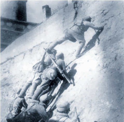 蟠龙战役中,战士们搭人梯冲上蟠龙镇城墙