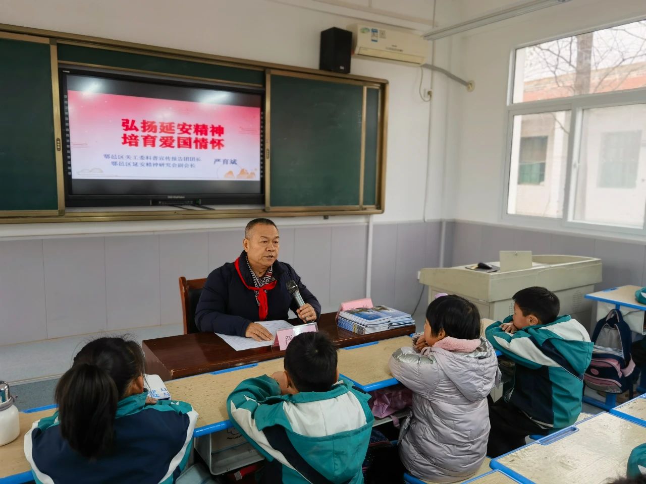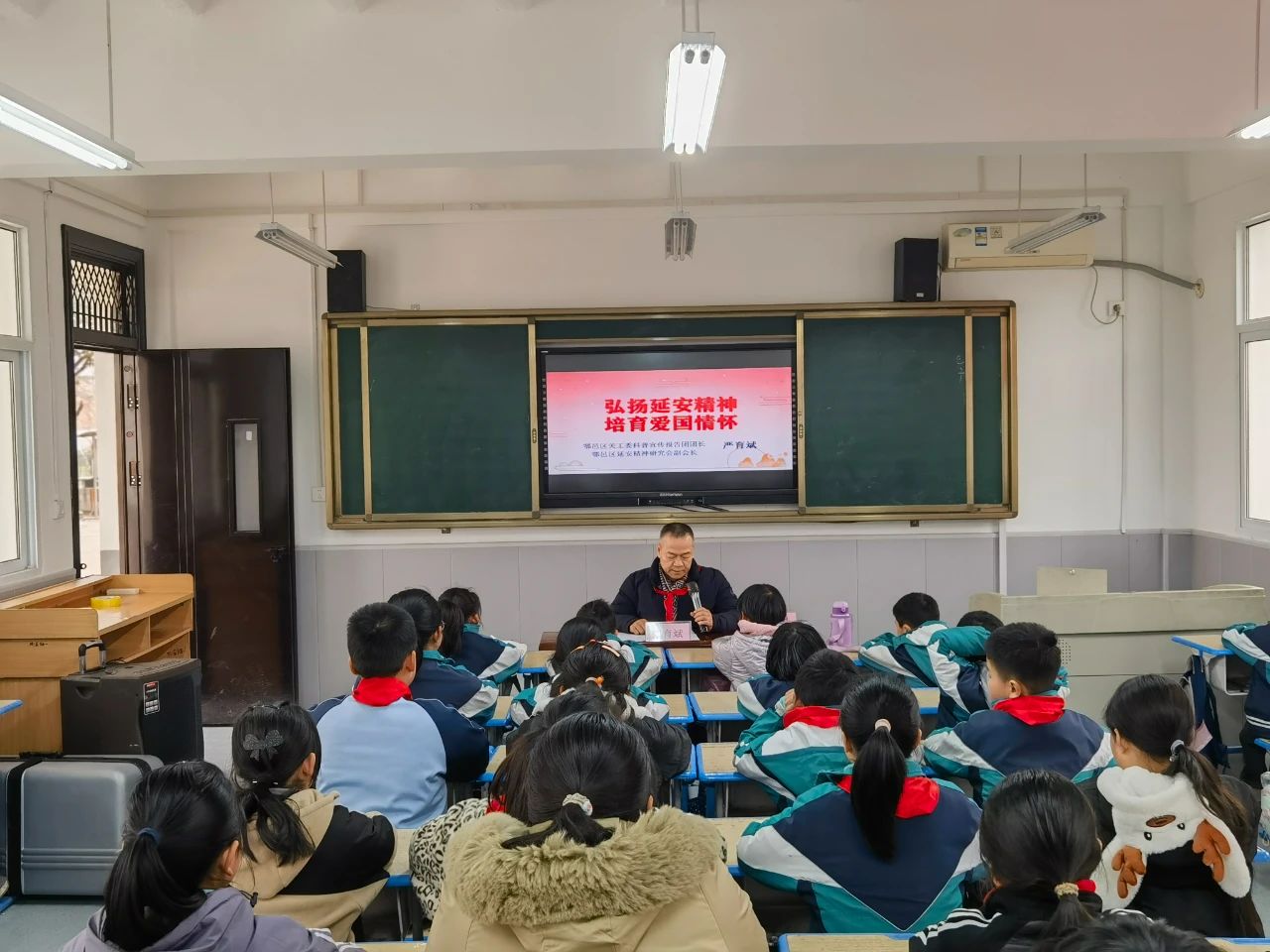 在学校课堂,全校30余名小学生组织有序,整齐就坐,活动在雄壮的国歌声中拉开帷幕,学校少年队代表向宣讲团成员佩戴红领巾。首先,鄠邑区延安精神研究会副会长、西安济仁医院院长严育斌向同学们宣讲题为《弘扬延安精神,培育爱国情怀》的专题报告,他用生动的历史事实向同学们讲述了我党在延安十三年艰苦奋斗、自力更生的伟大壮举,让同学们对“延安精神”所赋予的精神内涵有了更加深入的了解,同学们认真聆听,现场掌声阵阵。