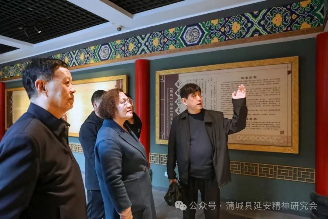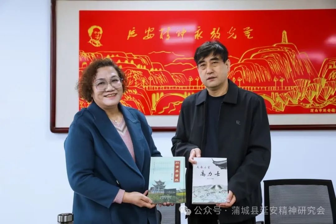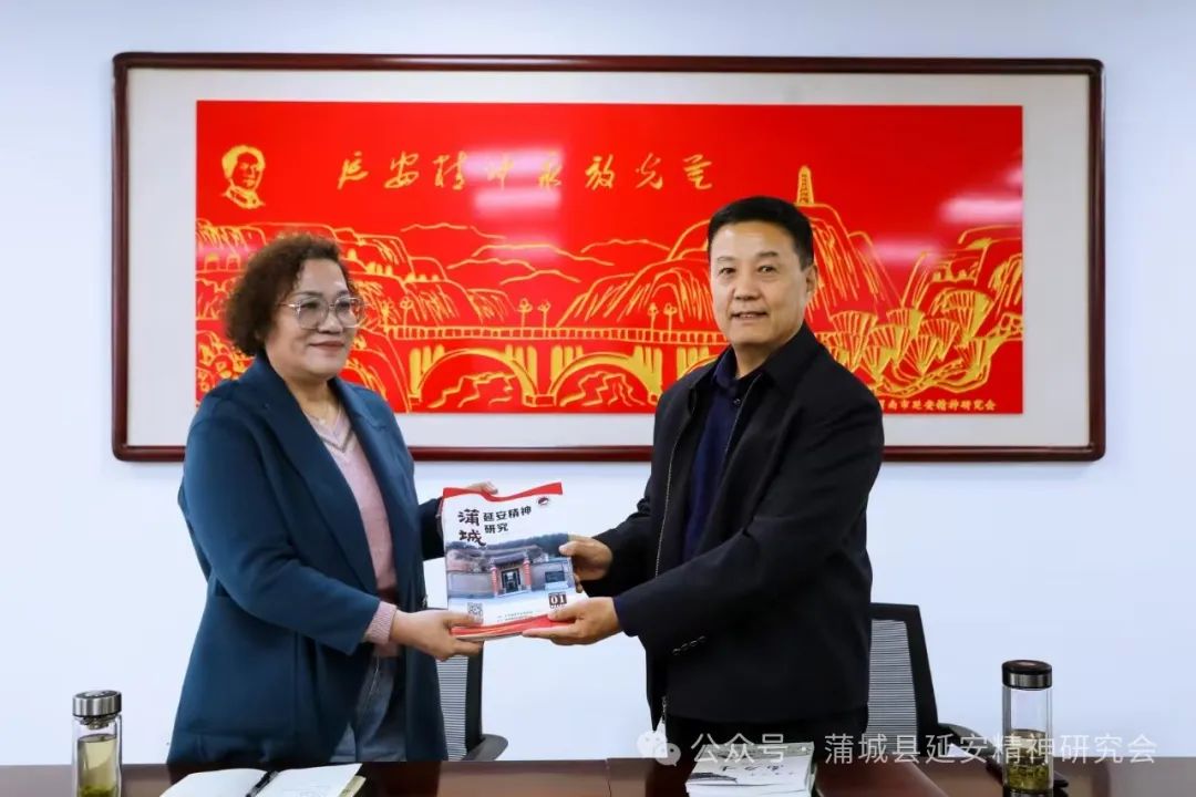 华阴市延会一行首先参观了蒲城县延会活动展室,在随后的座谈会上,蒲城县延会会长王树勋从当地红色文化的挖掘、延安精神在新时代蒲城当地的具体体现两个方面介绍了蒲城县历史文化、经济发展以及弘扬延安精神的整体思路和基本情况。他说:“弘扬延安精神从工作方式上讲主要是宣讲,就是以开展活动为载体,体现弘扬践行延安精神的深度和广度,体现延安精神的宏观效应。在蒲城县选择一批弘扬延安精神有特色的馆、所、校和企业,命名为‘延安精神宣传教育基地’、‘延安精神示范践行基地’。”同时,介绍了被叶剑英评价为“中国的夏伯阳”的抗日名将包森;智取华山的战斗英雄刘吉尧;陕西辛亥革命的先驱和杰出领导人之一,被孙中山先生誉为“西北革命巨柱”的井勿幕;曾任延安大学校长、西北人民革命大学校长、著名的新闻与教育工作者李敷仁;著名水利学家和教育家,我国现代水利建设的先驱李仪祉等蒲城籍历史名人。薛英会长表示,蒲城是一个人口大县,历史文化深厚,红色资源丰富,县延会工作局面可喜、成效可贺。座谈会上,双方还互赠了相关资料。