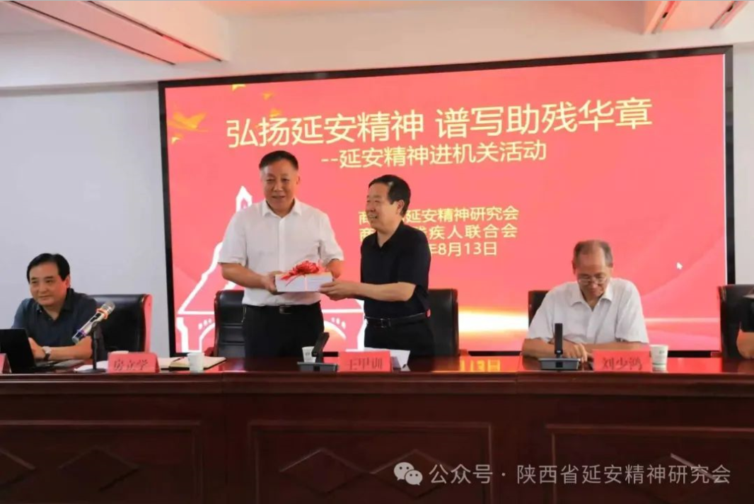 随后,八名书画名家向市残联赠送书画墨宝20幅,市延安精神研究会向市残联赠送《延安精神学习材料汇编》50本。市延安精神研究会副会长、市委党校教授王亚鹏作了题为"延安精神深刻内涵及其时代价值"的专题报告,深入浅出、生动活泼的阐述了延安精神原生形态、深刻内涵和时代价值,赢得了与会人员的阵阵掌声和赞誉。市延安精神研究会会长王甲训作了讲话,在充分肯定和高度评价市残联工作的基础上,提出了以下建议和要求:一是弘扬延安精神,坚定政治方向。要求各级残联,特别是残疾人朋友,要正确对待人生的各种挑战,从延安精神、自强模范先进典型上汲取力量,始终保持乐观向上的的心态,牢固树立战胜困难的信心和勇气,自觉将个人命运与国家的发展结合起来,以干事创业的实际行动为实现中华民族伟大复兴贡献自己的力量。二是弘扬延安精神,贯彻党的思想路线。要求残联根据残疾人追求美好生活的实际需求和个人身体特殊情况,科学制定切实可行的政策和措施,为残疾人提供更加精准有效的服务。鼓励残疾人打破传统观念的束缚,客观选择目标定向,勇于尝试新生事物,不断挖掘自身潜力,奋发图强,立足本职,为改善自己的生产生活条件和奉献社会、服务发展而努力奋斗。三是弘扬延安精神,践行根本宗旨。全心全意为残疾人服务,时刻关注残疾人生产生活状况,倾听他们的呼声,帮助解决他们在康复康养、教育就业、权益保障等方面的困难和问题,让他们都能享受到改革开放和社会发展的优惠成果。四是弘扬延安精神,努力干事创业。积极鼓励更多的残疾人朋友发扬自力更生、艰苦奋斗的精神,依靠自己的努力创造美好生活,热情奉献社会。五是凝聚社会力量、共谱残联华章。希望广大残疾人朋友以弘扬践行延安精神为内生动力,牢固树立远大理想和创业抱负,不断提高自己综合素质和创业能力,用自己的智慧和汗水书写精彩辉煌人生篇章。